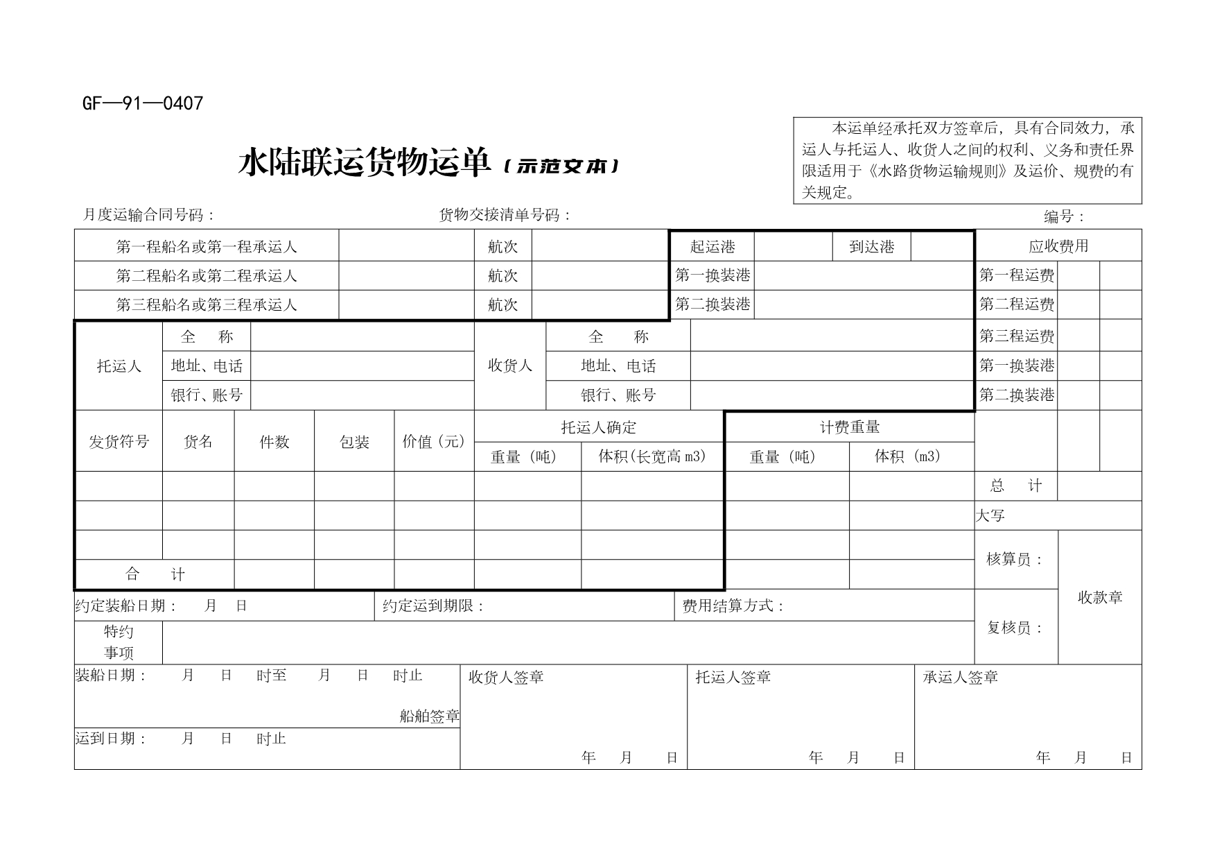 水陆联运货物运单(示范文本) 本运单经承托双方签章后,具有合同效力,承运人与托运人、收货人之间的权利、义务和责任界限适用于《水路货物运输规则》及运价、规费的有关规定。