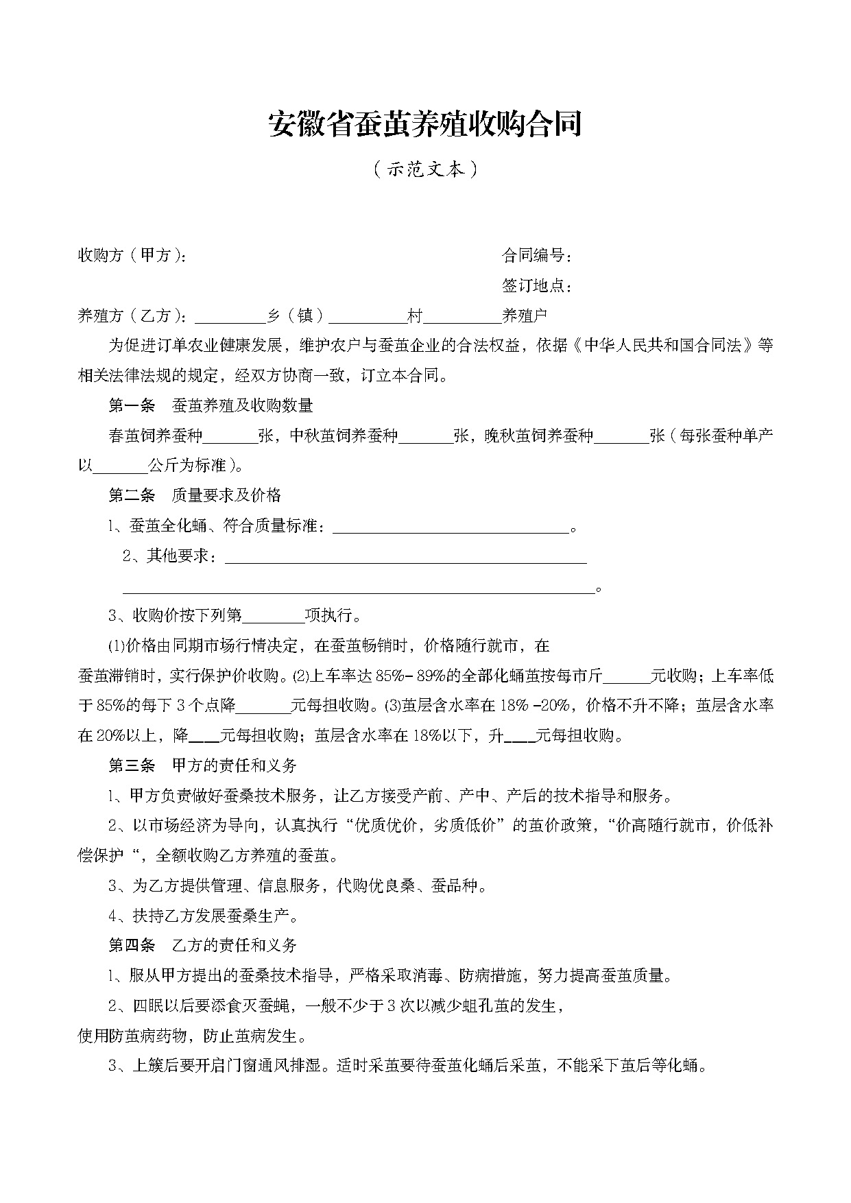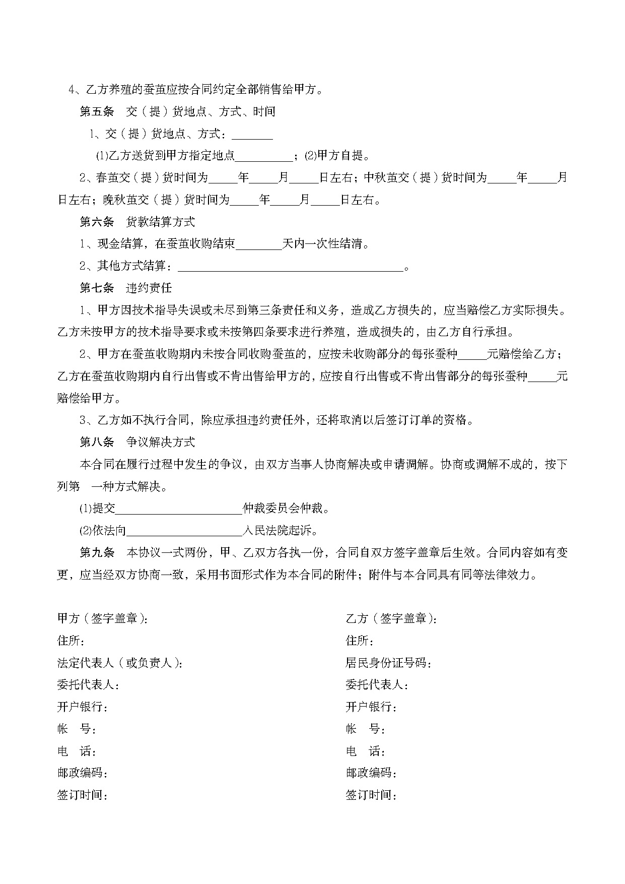 2、甲方在蚕茧收购期内未按合同收购蚕茧的,应按未收购部分的每张蚕种 元赔偿给乙方;乙方在蚕茧收购期内自行出售或不肯出售给甲方的,应按自行出售或不肯出售部分的每张蚕种 元赔偿给甲方。