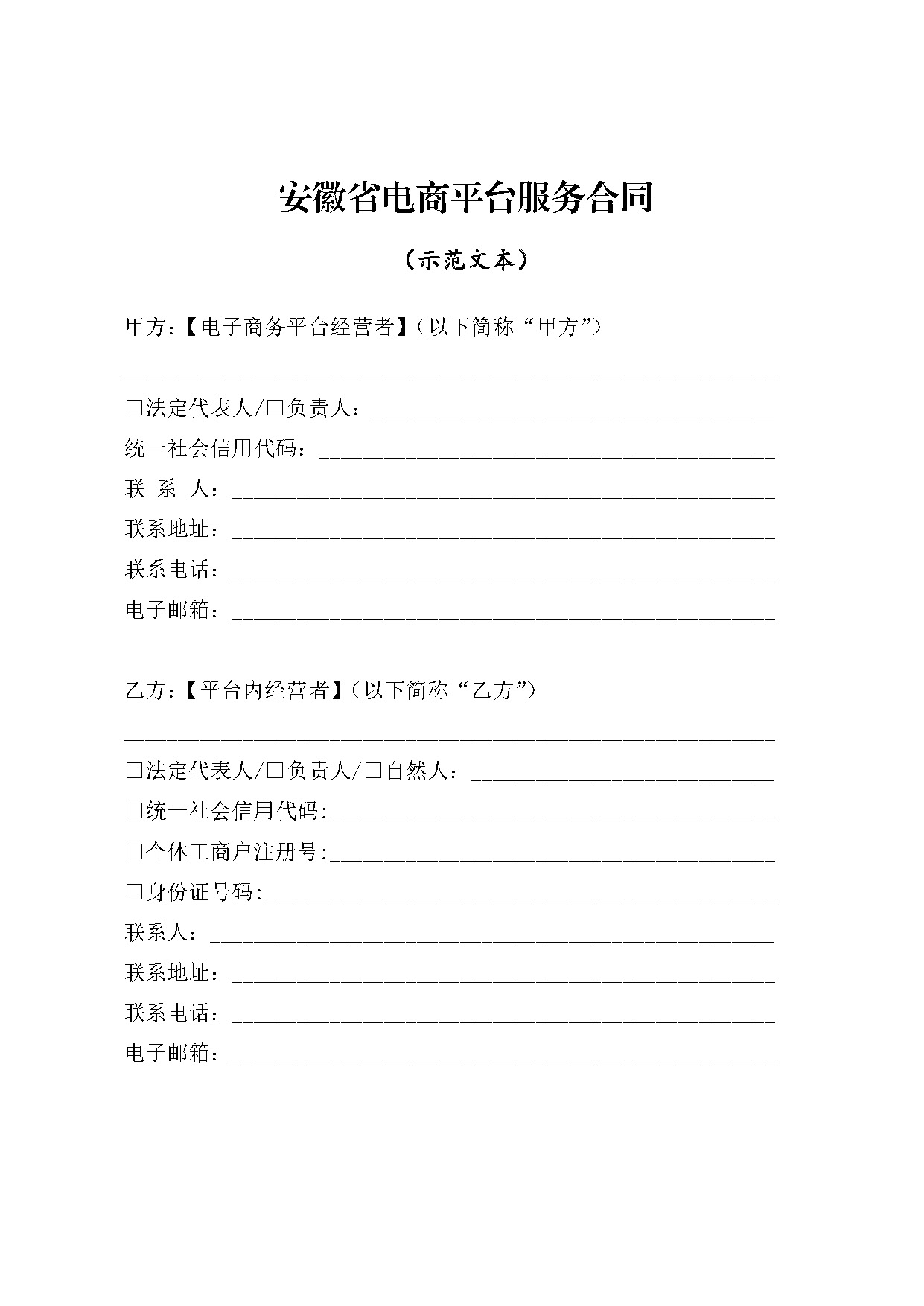 一、本合同为示范文本,供安徽省行政区域内电子商务平台经营者与平台内经营者签订服务合同时参照使用。