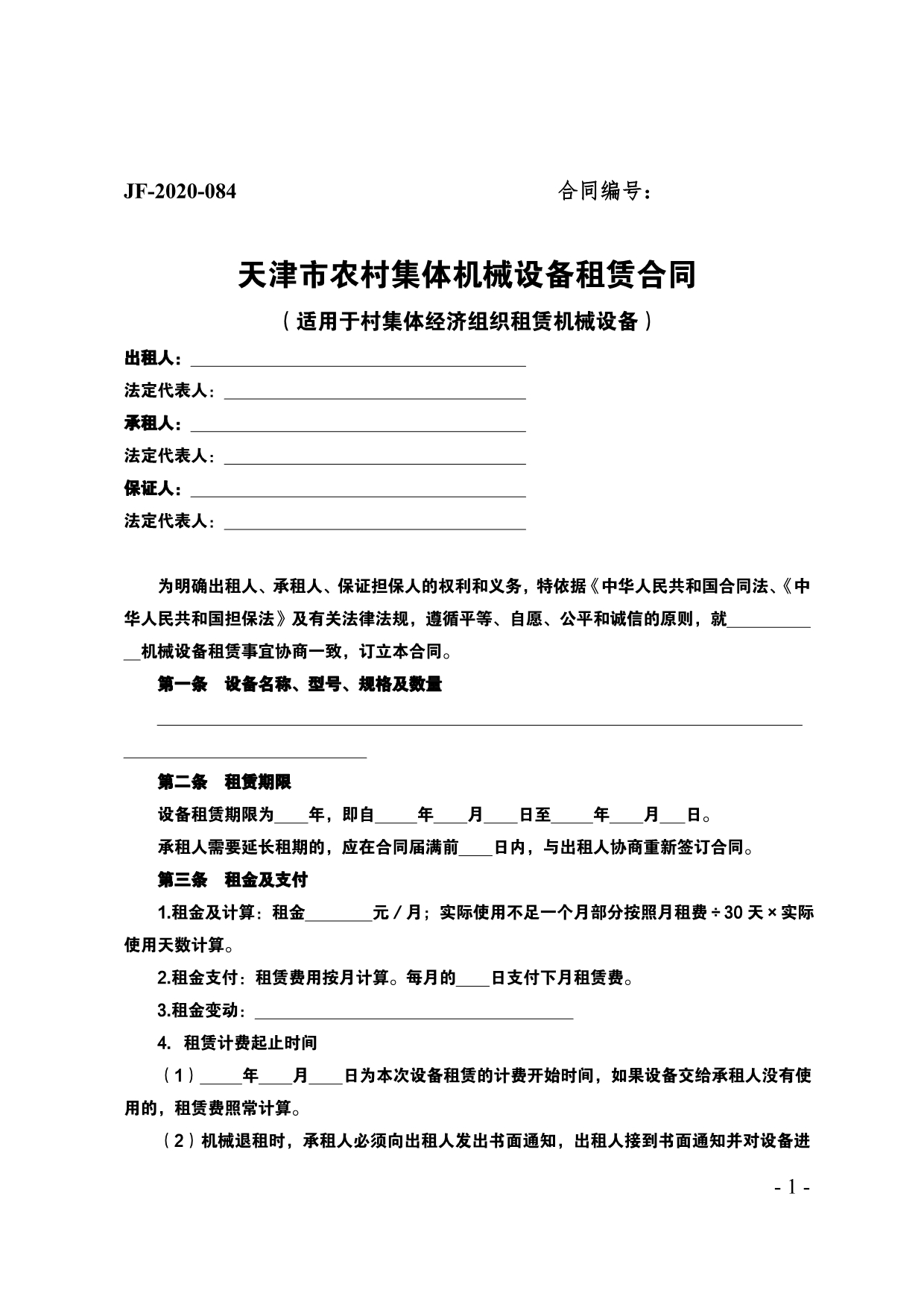 天津市农村集体机械设备租赁合同